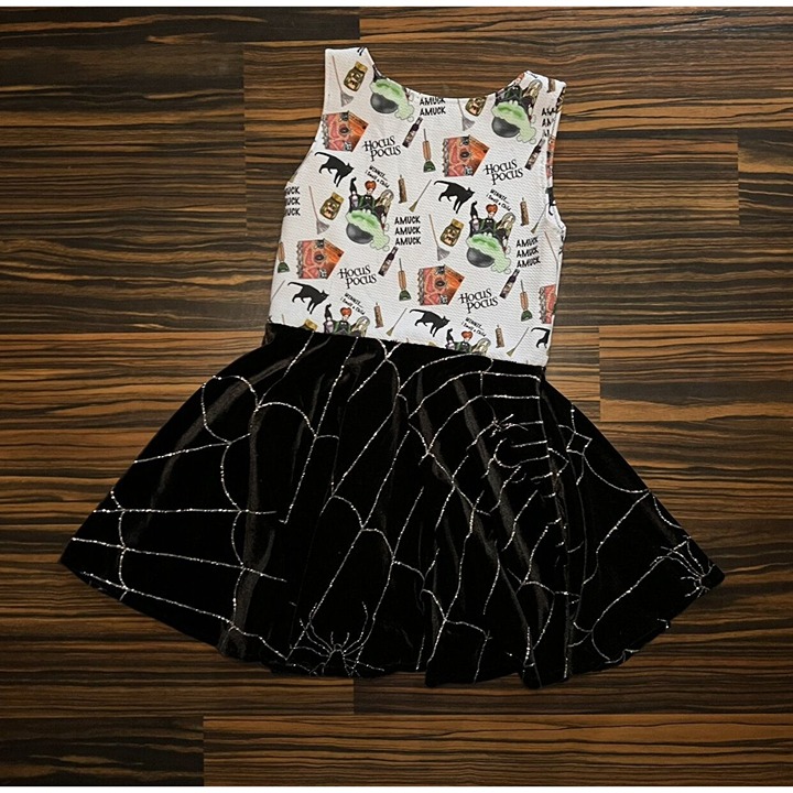 The stretchy tank style bodice features the Sanderson sisters & their magic book, potions, broom (and vacuum) and sayings like “amuk amuk amuk"