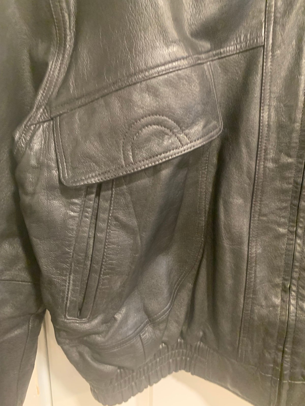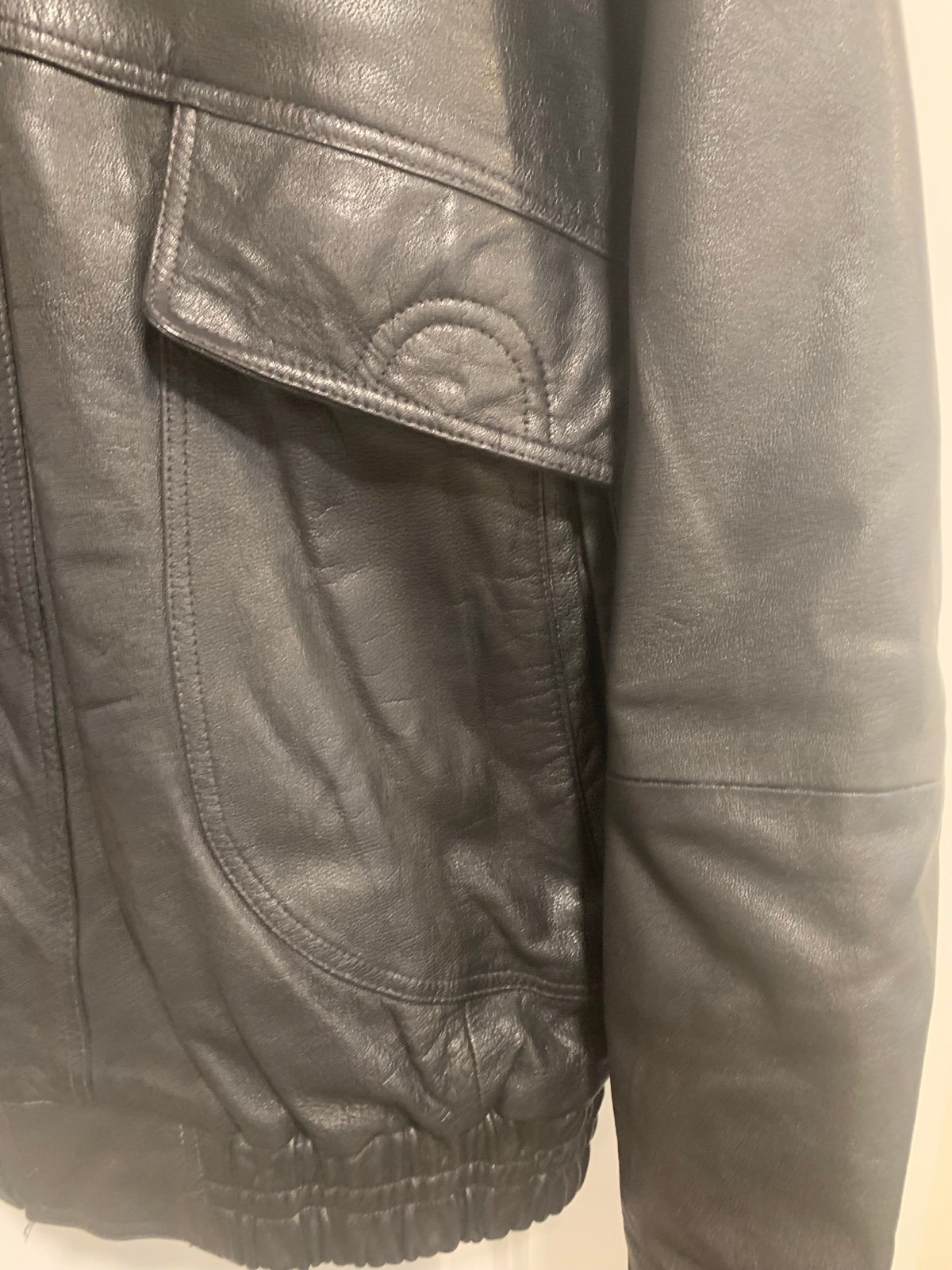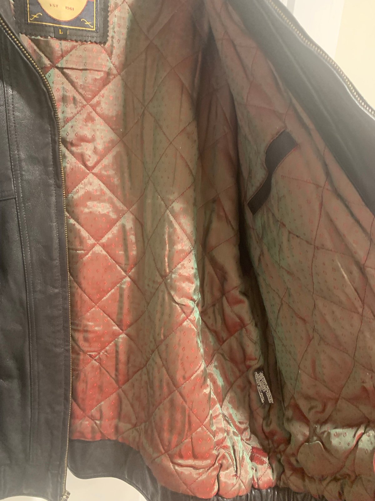 The product is a rare vintage Members Only leather jacket from the 80s, designed specifically for men in size L. The jacket is in black color with a classic motorcycle style, perfect for those looking for a unique and retro addition to their wardrobe. Made from high-quality leather, this jacket exudes a sense of nostalgia and style that is sure to make a statement.