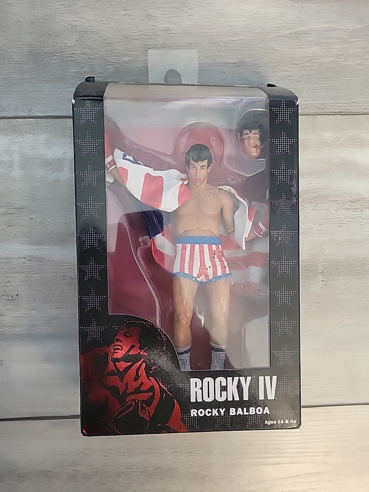 The NECA Rocky IV 40th Anniversary Rocky Balboa American Flag Action Figure is a collectible item celebrating the iconic character from the Rocky movie franchise. This 1:12 scale action figure features Rocky Balboa with a flag accessory, standing at 7 inches tall. Made of plastic and PVC material, this officially licensed reproduction is a must-have for fans of Sylvester Stallone's portrayal of the legendary boxer. Ideal for collectors aged 14 and up, this action figure is a unique addition to any TV, movie, and video game-themed display.