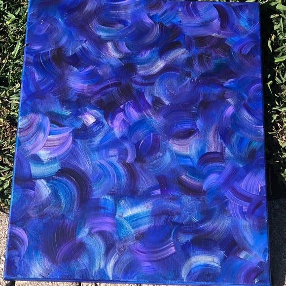 Handcrafted blue, purple and silver abstract waves. 16" x 20". Some pictures are in natural light and others are indoor. Sides are painted, so no frame is needed. Hangs easily with command strips. Very lightweight. Amy C. is the artist and my mom.