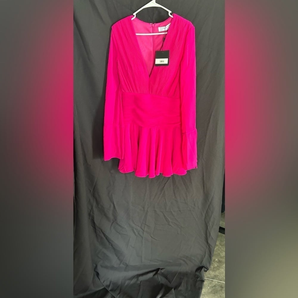 Flirty long sleeve chiffon cocktail dress with a pleated bodice and flowy bell sleeves.
