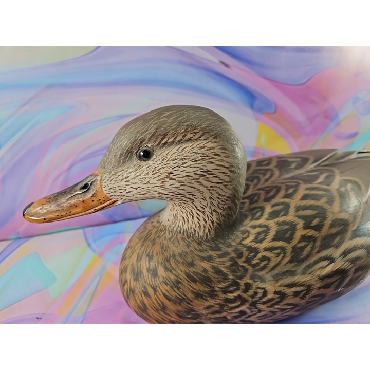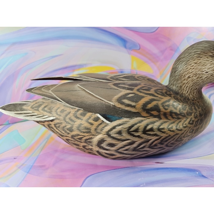 Really beautiful hand-carved hen mallard duck. Signed by the artist and dated "acquired 1984" on the bottom by the previous owner. Very slight cosmetic damage on the left side.