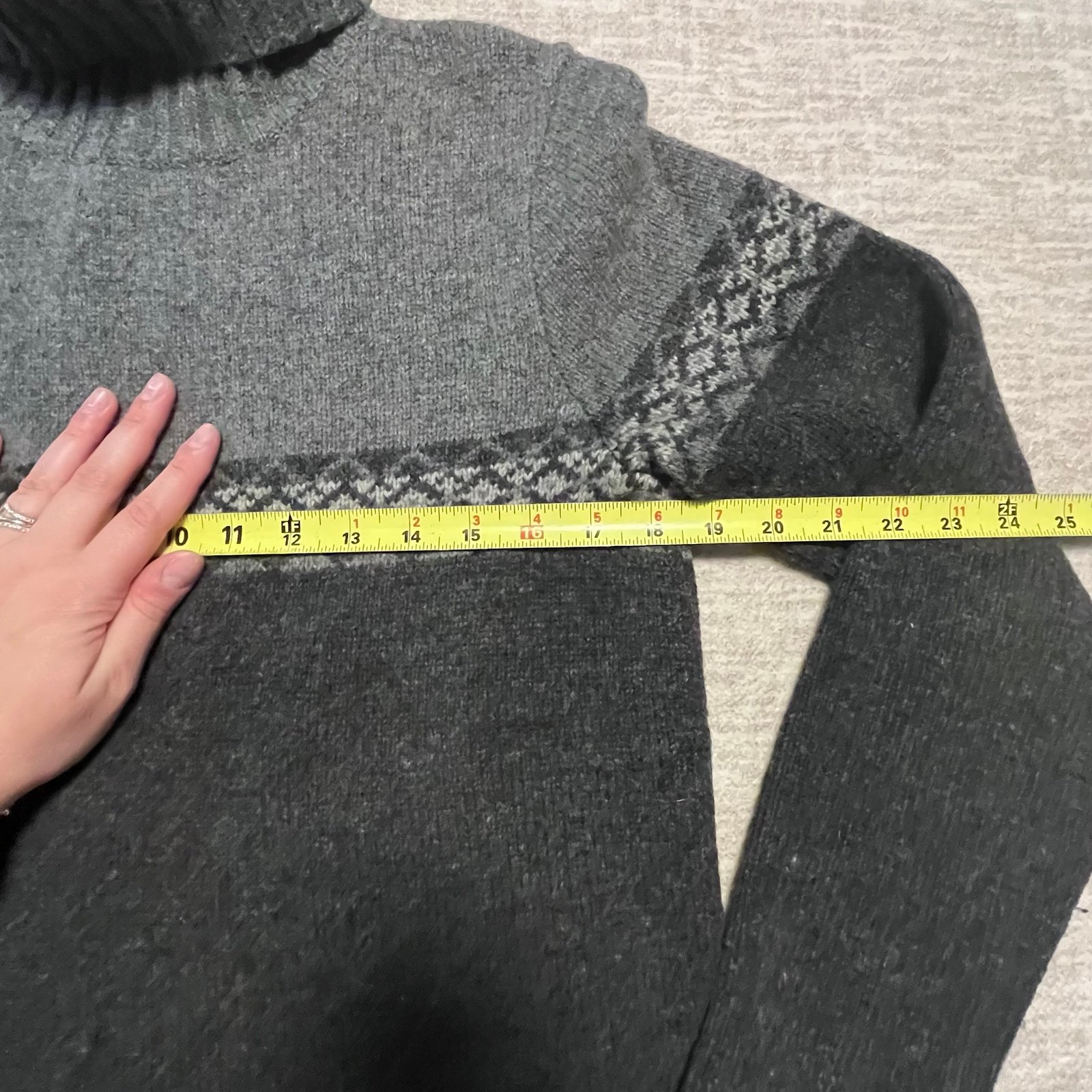 Classic and cozy Eddie Bauer 100% Lambswool Turtleneck Sweater, featuring a timeless two-tone gray color block design with a Fair Isle pattern across the chest. Made in Hong Kong — a vintage quality hallmark of Eddie Bauer craftsmanship. Perfect for winter, casual wear, or outdoor adventures.