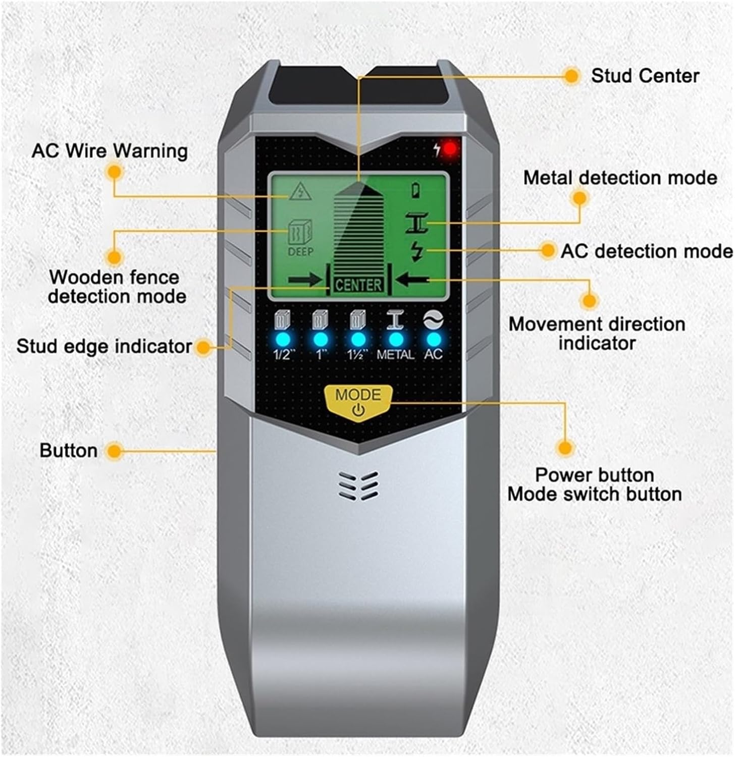 1. The wall stud finder can accurately and quickly find the edge and center of metal, studs, joists, pipes and live AC wires behind walls, floors and ceilings. Rapid detection saves users time and energy, making task completion easier.2. High visibility and comprehensive display, equipped with a bright backlit LCD display, which can show the center, edge and position of the detected studs and battery status.3. Multiple scanning modes, providing multiple scanning modes including stud scanning, depth scanning and metal scanning, allowing you to detect a variety of materials and depths.1.The 5-in-1 design is more powerful, more accurate and more durable.2.This product can quickly and easily locate the wooden metal studs, joists, metal pipe reinforcement and live AC wires behind walls, floors and ceilings.3.The alarm design allows you to always know the situation of the wall and make the operation more accurate.4.SH402 wall detector can clearly identify what objects are inside the wall, which is more intuitive and accurate. Wood detection, metal detection, current detection.5.It has a wide range of applications. You can use it whenever you want to view the interior of an opaque object.Model:SH402Net weight of product:170gAlarm mode:beepBattery type:9V dry battery (delivered without battery)Display:LED LCD green backlight screenColour:SilverMaterial:ABSSize:17.1x7x3.5cmPackage Contents:1 * SH402 detectorOnly the above package content, other products are not included.Note: Light reflection and different displays may cause the color of the item in the picture a little different from the real thing. The measurement allowed error is +/- 1-3cm.
