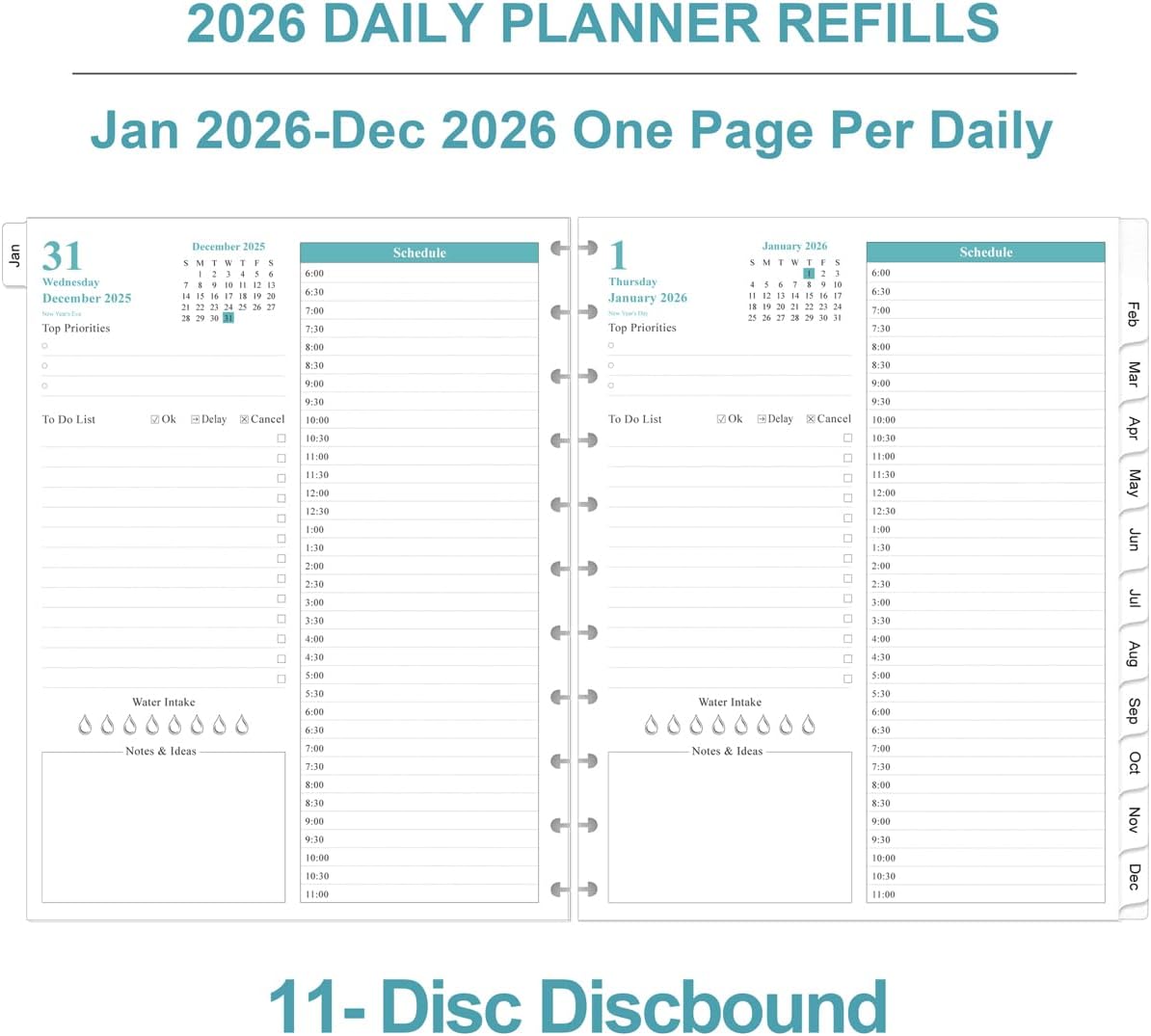 2026 DAILY PLANER REFILLS HELP YOUR LIFE MORE ORGANIZED Dates: January 2026 - December 2026, One Page Per Day Daily & Monthly Planner Size: 8.5 x 11 inches, Letter Size Hole:11-DiscTUL Discbound This planner refills compatible with : Staples Arc, Office Depot TUL, Talia, Levenger, Happy Planner, and other 11-disc letter size discbound notebooksUSEFUL PAGES: A4 Planning Pages | Monthly Tabs | Quick Reference Information | 2026 & 2027 Yearly Overview | Note Pages | Contacts | Important Dates | Monthly Tabs | Daily To Do | All these features help this planner be an effective planning tool.