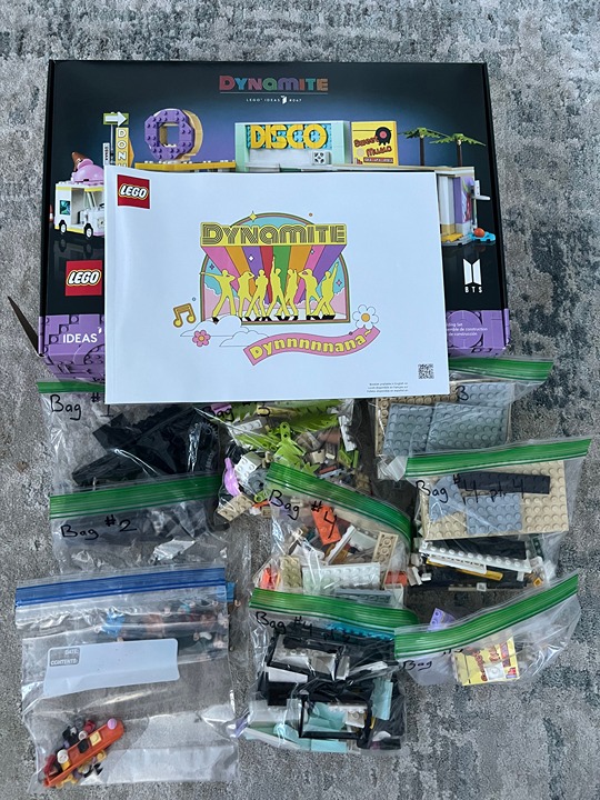 An Official BTS LEGO Set bought off the official website, has been built previously and displayed on shelf but all pieces are intact and are in baggies labeled