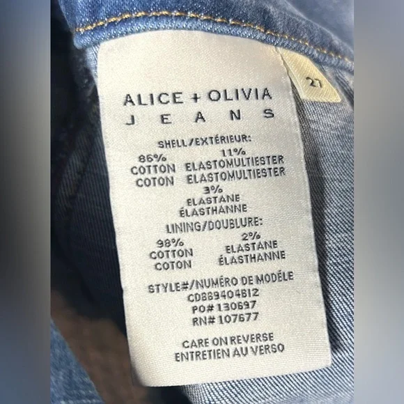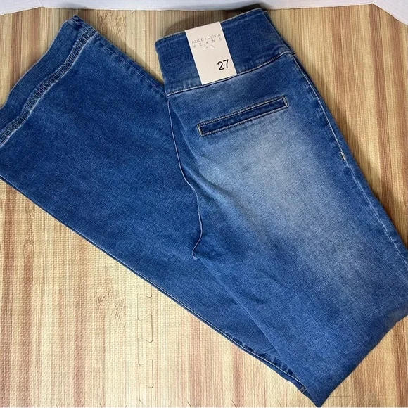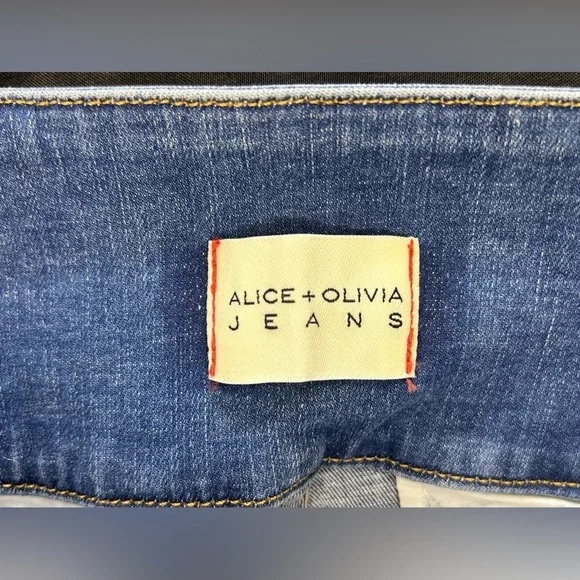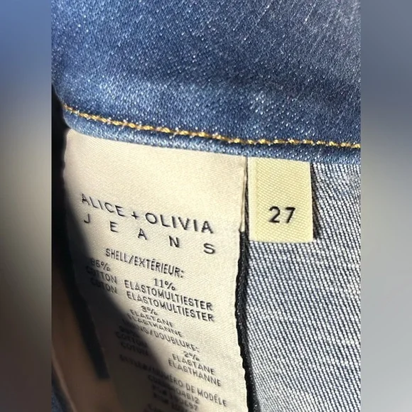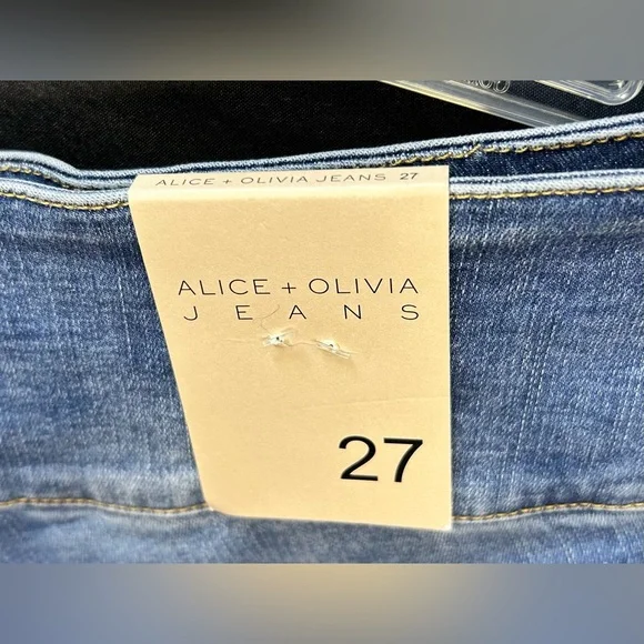 Alice + Olivia Bootcut Mid-Rise Olivia Jean Light Wash Women’s Size 27Alice + Olivia Brand Olivia Style Jeans Women’s size 27 Measurements: Waist-27”, rise-9”, inseam-34”, length-43” Best Intentions Light Blue Color Wash Our signature bootcut pant, now in denim that feels perfectly tailored for anything (office or after hours). The wide waistband is incredibly flattering (not that you need any help).-Bootcut jean-Mid rise-Wide waistband-Full length-Hidden front hook & eye and zipper closure-86% cotton, 11% elastomultiester, 3% elastane-Turn inside out and machine wash on cold-ImportedNew with tags Retails for $330285
