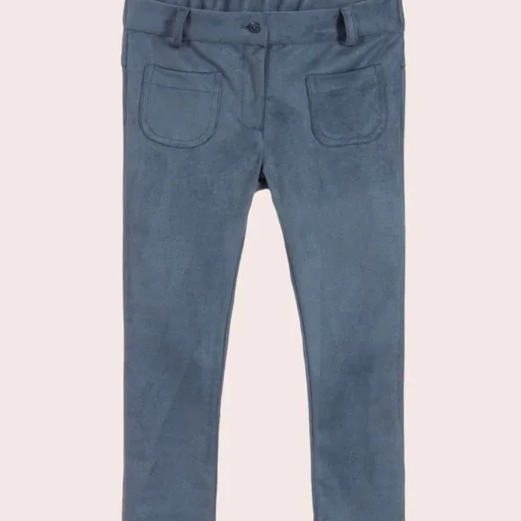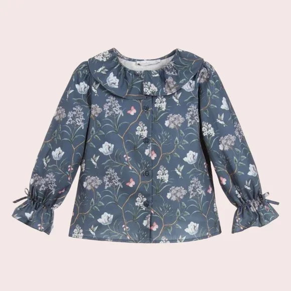 This stunning blouse is made from dark blue cotton viyella with a beautiful flowery garden print. It has lovely long-puffed sleeves with a small bow on the ruffles. The blouse has a cute, ruffled peter pan collar and fastens with buttons.The lovely pants are made from blue suede. Machine wash max. 30ºC Exclusive design Made in Spain