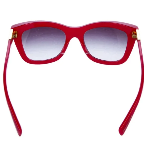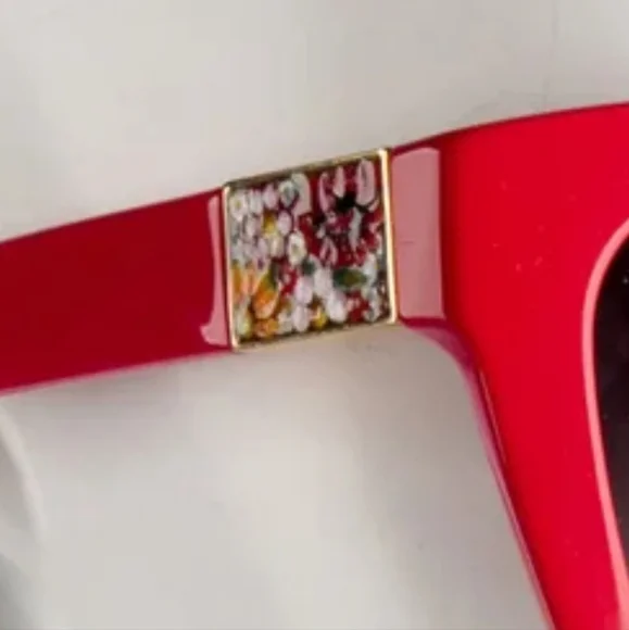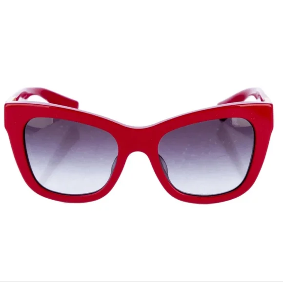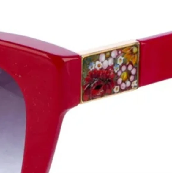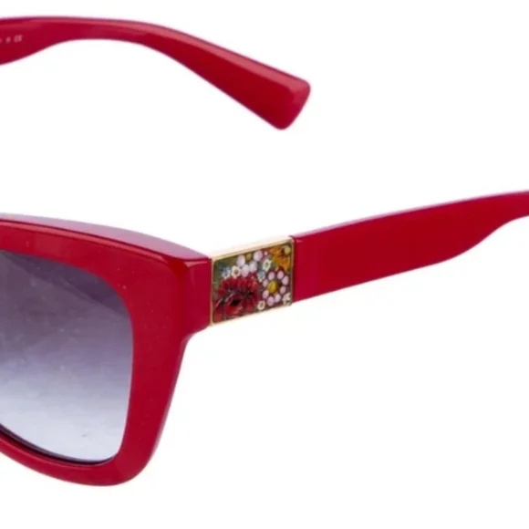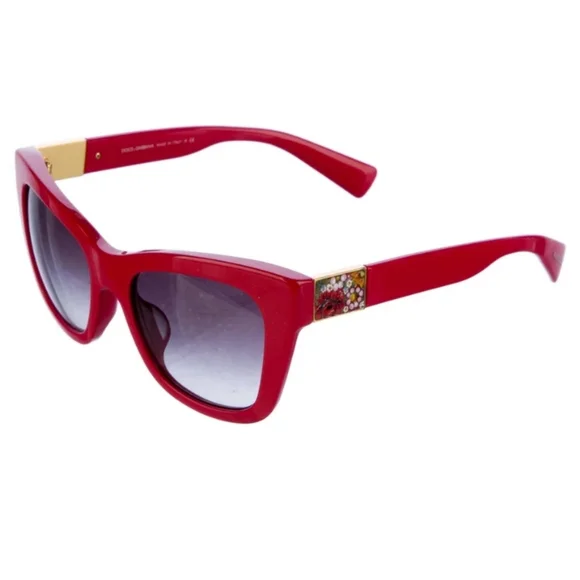 The Dolce Gabbana RED Oversize Sunglasses feature a striking red frame with handpainted-enamel floral adornment on each side with gradient gray lenses, giving them a stylish and unique look. Designed for women, these sunglasses exude a bold and fashionable vibe, perfect for adding a pop of color to any outfit. Made from high-quality acetate, they offer both durability and comfort for everyday wear. The oversized style adds a trendy touch, while the flower theme adds a whimsical element to the overall design. Complete with a matching case for safe storage and transport.Dolce & Gabbana Oversize SunglassesRed AcetateGradient LensesIncludes Case