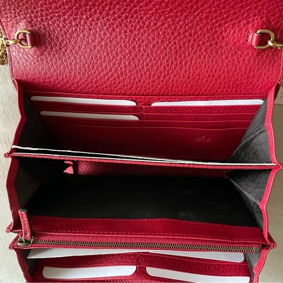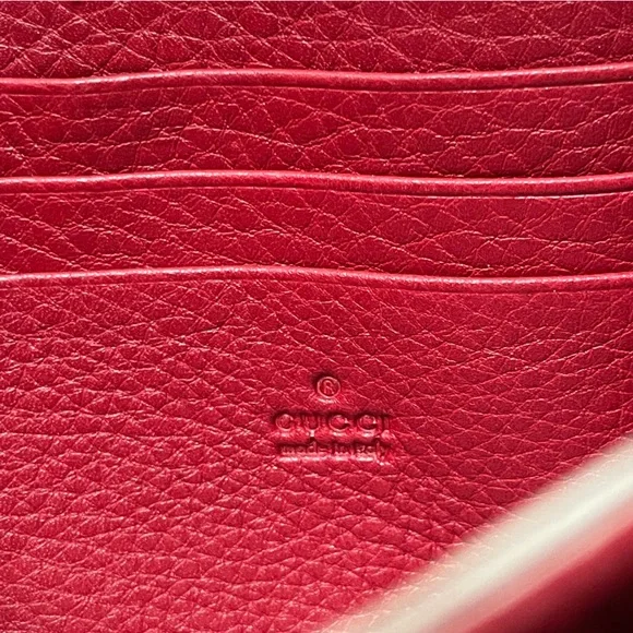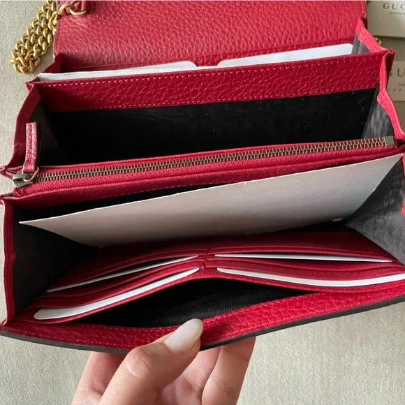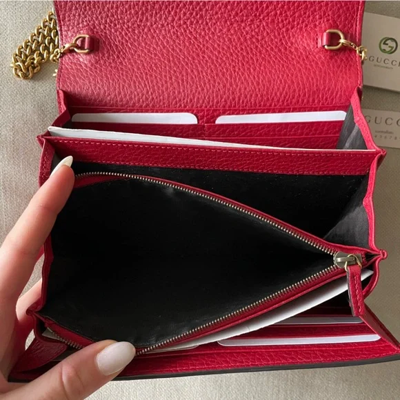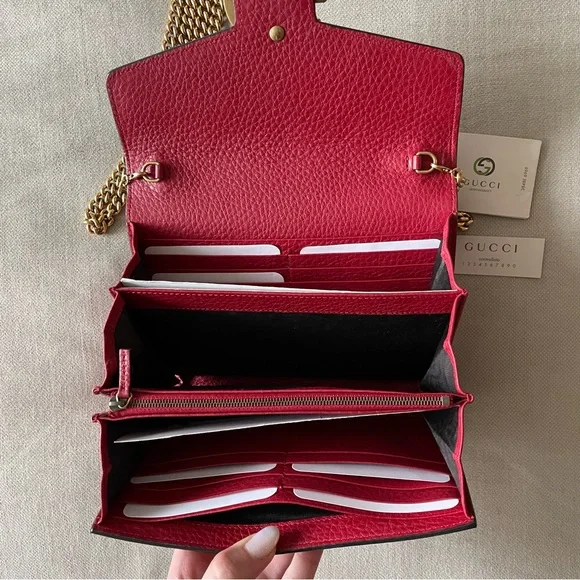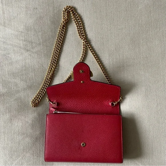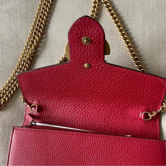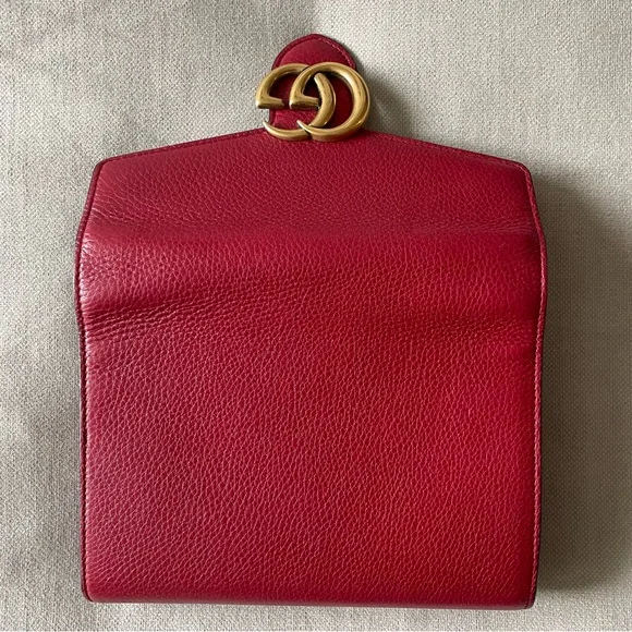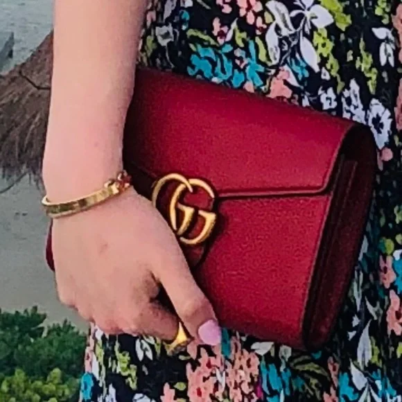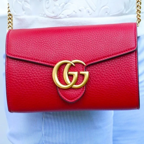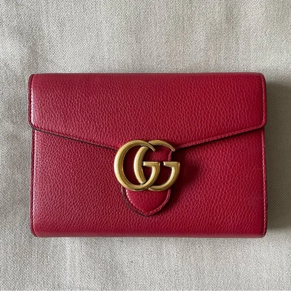 ❤️GUCCI❤️GG Marmont Leather Chain Crossbody Shoulder BagSuper cute can be worn as a crossbody bag or removing the chain to wear as a clutch.Color: Red, goldSize or dimension: W 7.78" H 5.1" D 2.3"Condition: Great used condition. Small dent near clasp closure pictured. Small marks inside lining pictured. Has been kept in storage. Comes with: box but no dust bag, removable chainPlease pay attention to pics as price reflects condition.Feel free to ask any questions!