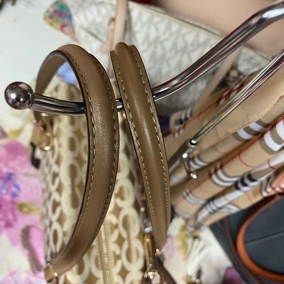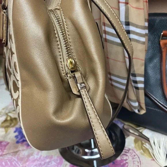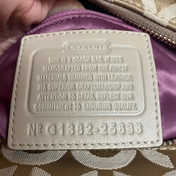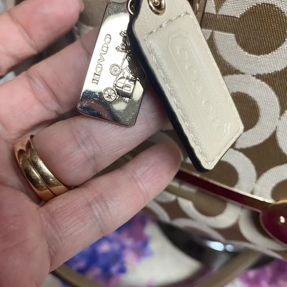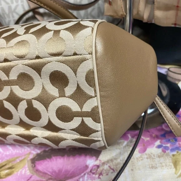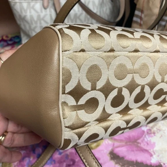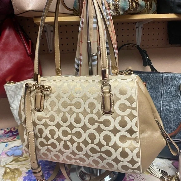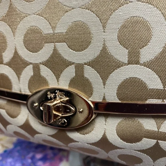 Coach Madeline Stunning convertible crossbody Approximate measurements 11 1/2”L * 7 1/2”T * 4 1/2”W7 1/2” handle drop45 1/2” adjustable strap (measured as pictured)Exterior details Gold and off white signature sateen Tan leather trim2-non adjustable straps1-adjustable/removable crossbody strap 1-brass turn lock closure front pocket1-brass hang tag1-leather hang tagInterior details 1-full zipper compartment with leather pull1-zipper pocket with Leather pull2-multifunctional slip pocketsShe’s in absolute beautiful condition Pleases enlarge ALL pictures and review video for details and condition as they are part of the description All items are packed and shipped with care 🎁 📫 ❤️ All items in my closet are cross listed on 3 platforms and in my consignment shop.If you love it today……. It might be gone tomorrow All reasonable offers accepted or bundle with 2 or more items and receive a discount with reduced shipping Thank you for shopping my closet ❤️ 08/23/23