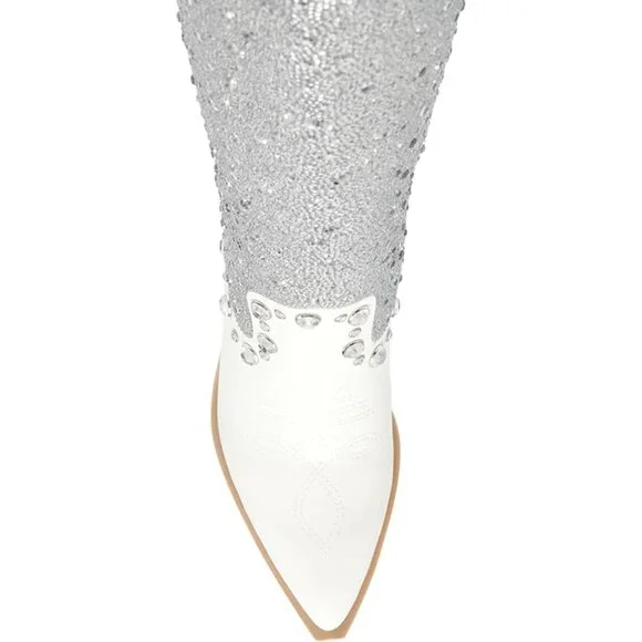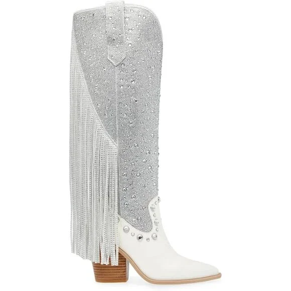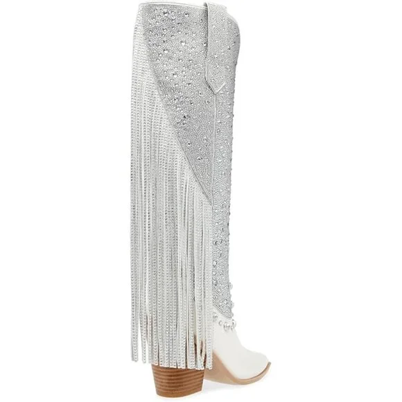 Steve Madden Lexy White Silver Fringe Embellished Western Knee High Boots - NEW IN BOXDazzle your shine with sumptuous grace wearing the Steve Madden® Lexy Knee-High Boots. Featuring shiny beaded and fringe embellishments, this pull-on footwear has leather upper construction with block heels and a snip toe silhouette.Measurements:Heel Height: 3 1⁄2 inWeight: 10 ozCircumference: 15 in20% OFF WITH FREE SHIPPING - ON SAWYER RODE OUTFITTERS (Link in bio)
