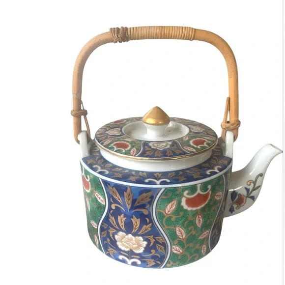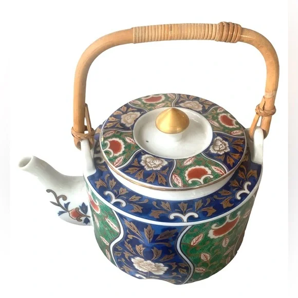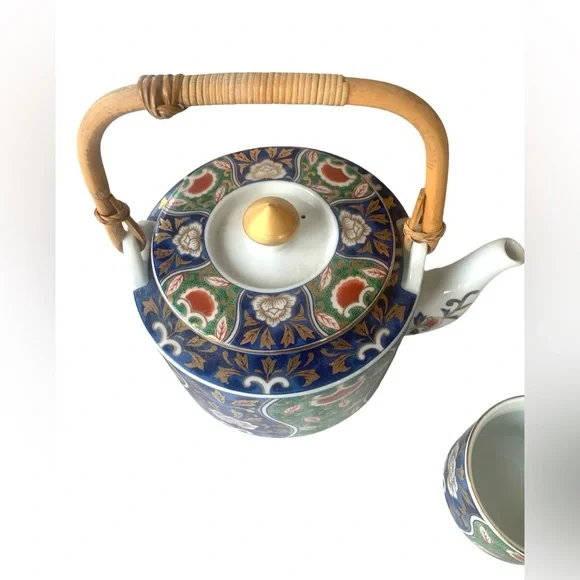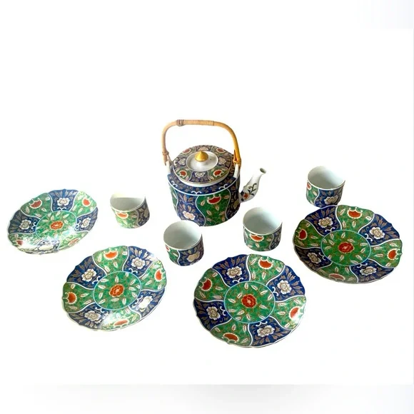 ♥️EXTRA POSTAGE REQUIREMENT - INCLUDED IN $85. PRICE♥️12 piece Vintage Otagiri Japan Kozan Gama gilded floral tea setlikely dating back to the mid-20th century. The set includes a teapot with a bamboo handle and LidSix Sake Cups FourSandwich / Desert PlatesThe pieces feature a detailed floral design in green, blue, and red with gold accents on a white background.Kozan Gama is a mark associated with Otagiri, a Japanese company known for producing decorative ceramic and lacquerware items, particularly for export.These sets are collectible