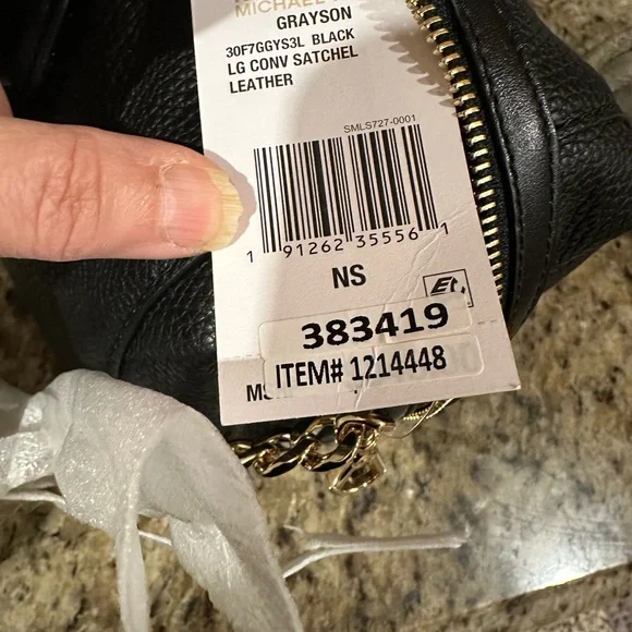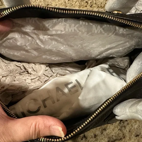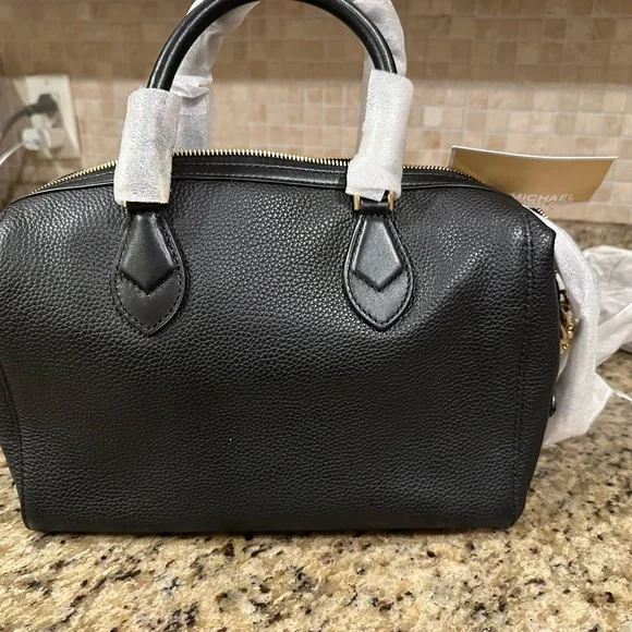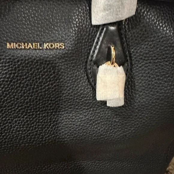MICHAEL Michael Kors bagLeather and polished gold tone hardware5"L double handles; 20-1/2" to 24" adjustable strapTop zip closureExterior features gold-tone hardware, logo and lock charmInterior features 1 zip pocket, 2 slip pockets and key clip12 3/4" W x 8" H x 6 1/4" DDust bag and care card included