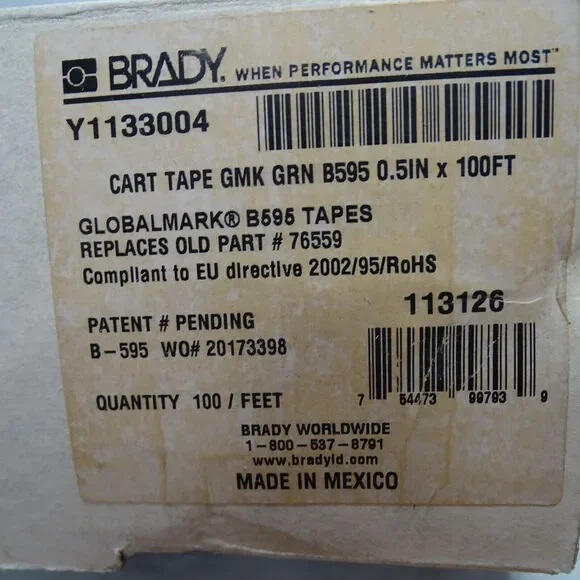 Brady - Y1133004Cart Tape GMK GRN B595 0.5IN x 100FTReplaces Old Part # 76559Thank you for your continued support since 2015!!!Photos show the EXACT item you'll be receiving. Please review these photos carefully so you're best aware of the condition before purchasing.All items are guaranteed.Shipping + PackagingI ship all items ASAP.Weekend Orders/Late Friday Orders will Ship on Monday.Please message me with any questions and concerns.